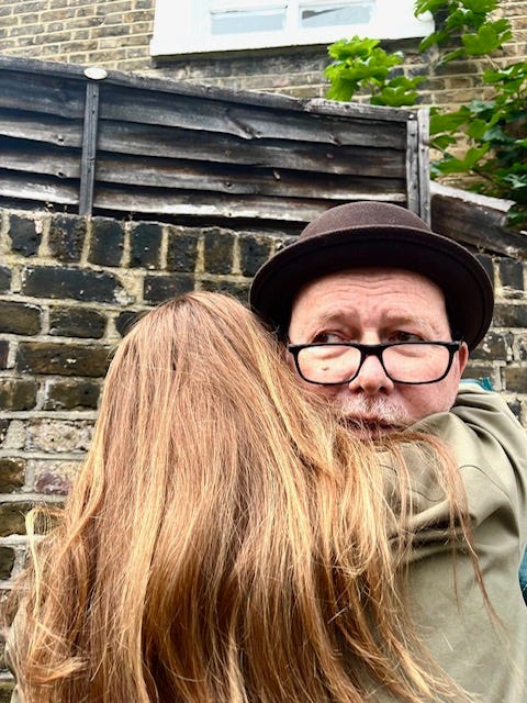 I melted away. And remembered this picture as I fled. The guy in the picture has gone into freeze and started to panic, and just as he began to feel the flight of his marbles — of all the luck! — his beloved daughter hoved round the corner and ran to his rescue — just as she always has. He loves her beyond measure.